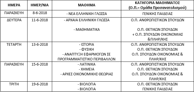 Πρόγραμμα Πανελλαδικών Εξετάσεων έτους 2018 των Ημερήσιων και Εσπερινών Γενικών Λυκείων