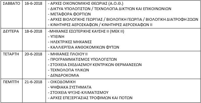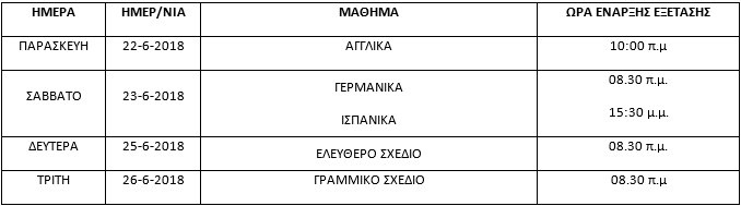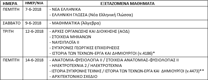 * Την Τρίτη 12-6-2018 στο μάθημα ΙΣΤΟΡΙΑ ΤΩΝ ΤΕΧΝΩΝ-ΕΡΓΑ ΚΑΙ ΔΗΜΙΟΥΡΓΟΙ εξετάζονται α) οι μαθητές/-τριες της Δ΄ τάξης εσπερινών ΕΠΑ.Λ σχ. έτους 2017-2018 και β) οι απόφοιτοι/-ες της Δ΄ τάξης εσπερινών ΕΠΑ.Λ. παρελθόντων ετών που διεκδικούν το ειδικό ποσοστό 1% επιπλέον των εισακτέων στην Τριτοβάθμια Εκπαίδευση (ΜΟΝΟ για ΤΕΙ, ΑΣΠΑΙΤΕ, ΑΣΤΕ, ΑΕΝ).